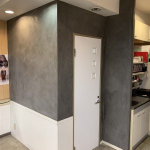 白を基調とした壁紙をモールテックスで施工しガラリと雰囲気をチェンジ。モールテックスと相性の良い木の素材はそのまま残し柔らかさと温かさの残る壁へと生まれ変わりました。